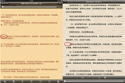 下圖左側是GoodReader中不處理空行的閱讀效果,顯而易見(jiàn),存在很多無(wú)用空行,而在A(yíng)pabi Reader中選擇“忽略所有空行”后,閱讀體驗有明顯改進(jìn);此外,Apabi Reader 對中文排版的支持性也非常不錯,例如從左圖可以看出,原始TXT文檔是缺少首行縮進(jìn)排版信息的,而Apabi Reader則對段首縮進(jìn)兩字符做了相應處理: