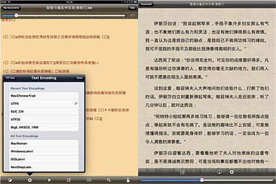 Apabi Reader在閱讀TXT時(shí)另一個(gè)優(yōu)勢在于閱讀器能夠智能識別主流的TXT文字編碼并做出相應的自動(dòng)調整,對于中國用戶(hù)來(lái)說(shuō),這無(wú)疑是一個(gè)很貼心的功能。某些閱讀器軟件例如GoodReader閱讀中文TXT時(shí)由于無(wú)法識別中文編碼會(huì )造成亂碼問(wèn)題,需要用戶(hù)手動(dòng)從編碼列表中選出正確的編碼才能顯示文字,而Apabi Reader則為用戶(hù)省去了這一繁瑣的過(guò)程。