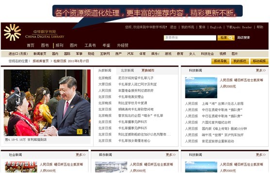 方正阿帕比產(chǎn)品部負責人介紹說(shuō):新版中華數字書(shū)苑與眾多電子文獻數據庫相比,后者更偏重于文獻整合、文獻檢索,而前者將文獻資源以頻道化展示,不僅優(yōu)化了數據庫的文獻整合檢索的根本功能,還為讀者提供了界面更友好的、多資源類(lèi)型的數字文獻資源庫。