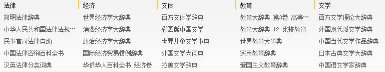 主要收錄國內各大出版社各個(gè)領(lǐng)域的權威工具書(shū),目前已經(jīng)收錄了《中國大百科全書(shū)》、《漢語(yǔ)大詞典》、《辭?!返葯嗤ぞ邥?shū);
