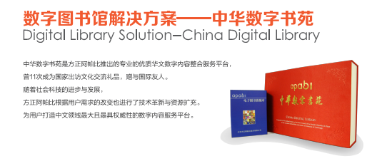 中華數字書(shū)苑是方正阿帕比推出的專(zhuān)業(yè)優(yōu)質(zhì)華文數字內容整合服務(wù)平臺,收錄了建國以來(lái)大部分的圖書(shū)全文資源、全國各級各類(lèi)報紙及年鑒、工具書(shū)、圖片等特色資源產(chǎn)品,旨在為圖書(shū)館、學(xué)校、企業(yè)、政府等客戶(hù)及其所屬讀者提供在線(xiàn)閱讀、全文檢索、離線(xiàn)借閱、移動(dòng)閱讀、下載、打印等數字內容和知識服務(wù)。